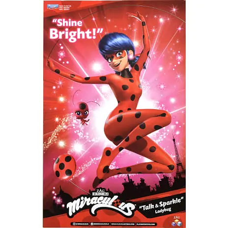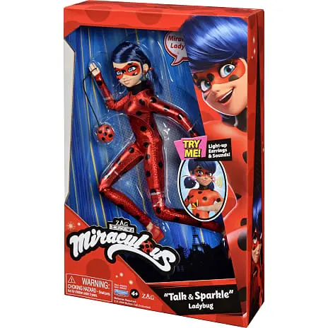 Det er tid til forvandling med den talende og glitrende Ladybug! 10.5″ Deluxe Feature Ladybug dukke med nyt, glitrende kjole, lysende øreringe og lyde! Tryk på knappen på hendes krop for at aktivere lys, glitrende Miraculous øreringe og velkendte lyde og udtryk fra tv-serien! Ladybug er klædt i en deluxe, glitrende superheltetøj! Hør Ladybugs forvandlingsudtryk: MIRACULOUS LADYBUG, LUCKY CHARM og meget mere! Den mirakuløse temasang er også inkluderet. Hendes signatur Yoyo accessory følger også med.