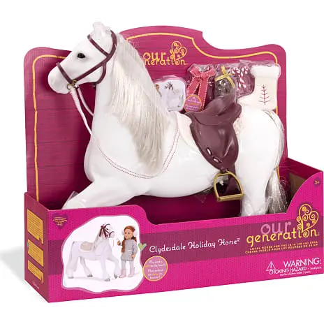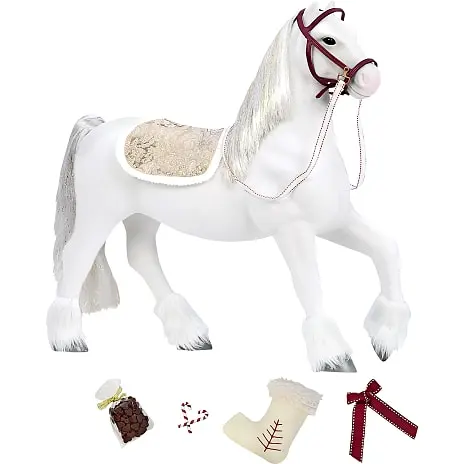 Inkluderer: Hest med 4 klovmanchetter, tæppe, hovedtøj og tøjler, hårsløjfe, 2x candy canes, pose med heste godbidder og ferie strømper. Dukker og tøj sæt sælges separat. Indretnings tilbehør er ikke inkluderet.