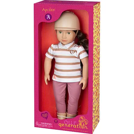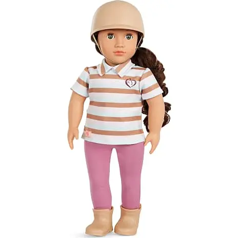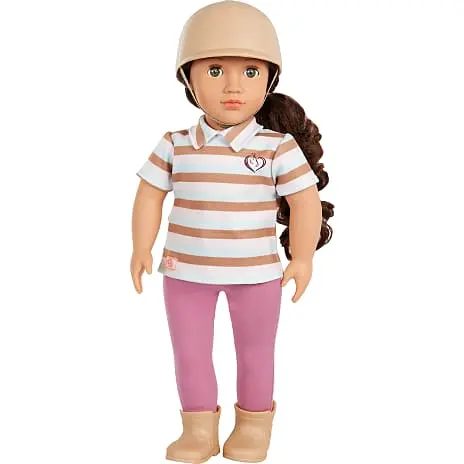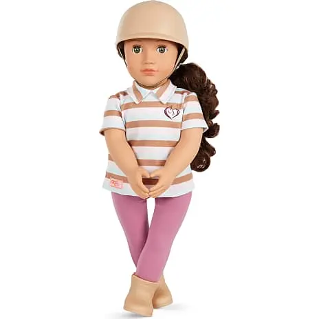 Denne Our Generation 46 cm ridedukke har lysegrønne øjne, der åbner og lukker, og hendes lange, brune hår er sjovt at børste og sætte.