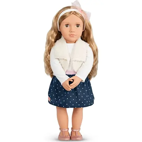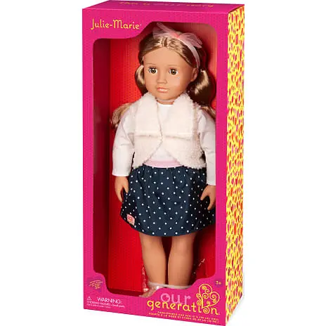 Julie-Marie er en sød, sjov og altid modebevidst 46 cm dukke fra Our Generation, som er klar til at opdage trendy stilarter! Hun har en blød krop, der er til at kramme, og livagtige træk, lige fra de smukke nøddebrune øjne, der kan åbnes og lukkes, til det lange blonde hår, der er sjovt at style. Hun kommer iført en vest i kunstpels, en langærmet top, en polkaprikket nederdel og et pandebånd med en smuk sløjfe med blonder! Når det er tid til at klæde sig ud, har hendes tøj let åbne lukninger, så hun hurtigt kan tage det på og af. Så du kan blande, matche og give Julie-Marie flere sjove looks på hvert eventyr!