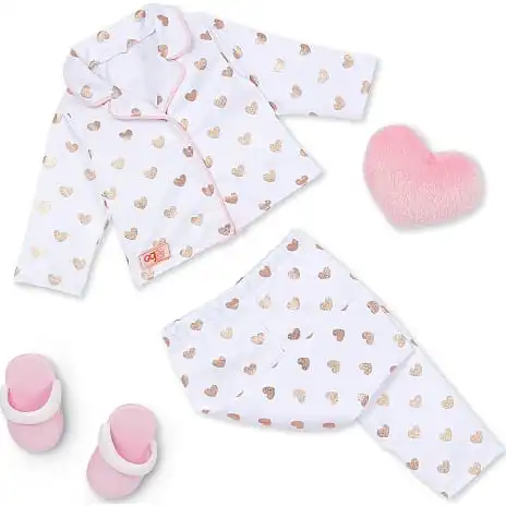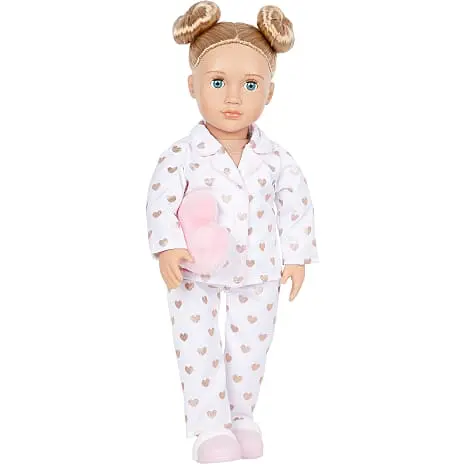 Serenity er klar til en slumrefest. Hun ankommer iført et matchende nattøj i et gyldent minihjertemønster med sin yndlings plyshjertepude. Og det søde par hjemmesko hjælper hende med at gå fra sengen til morgenbordet. Hendes outfit har også lette åbne/lukke-løsninger, der hurtigt kan tages af og på, så Serenity kan blande, matche og starte ethvert eventyr i legende stilarter. Dette smarte dukketøj en del af det skønne tilbehør fyldt med detaljer, der følger de fantastiske Our Generation-dukker.