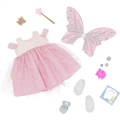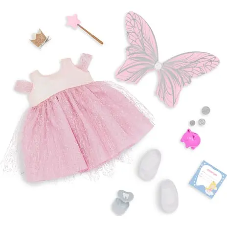 Hun ankommer iført en fortryllende fekjole med et skinnende overstykke, fevinger, en stjernestav og et par gennemsigtige sko. Hendes outfit leveres også komplet med en charmerende krone.