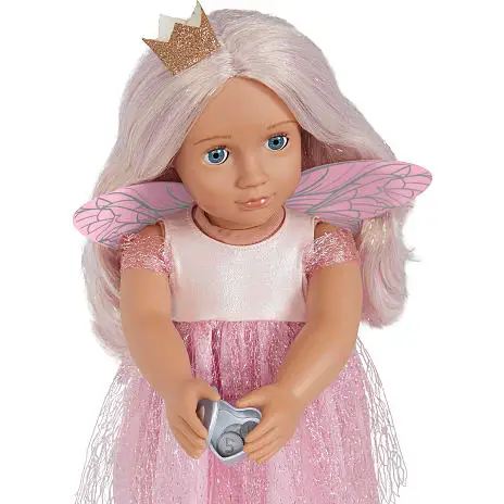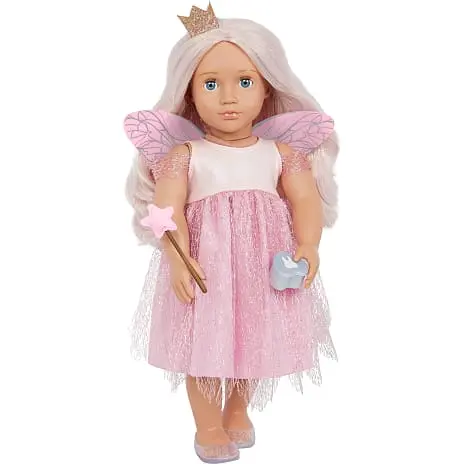 Denne Our Generation 46 cm dukke har lyseblå øjne, der åbner og lukker, og hendes lange, glitrende blonde hår er så sjovt at style.