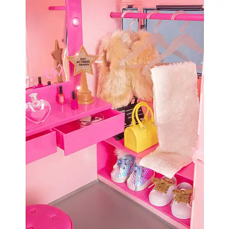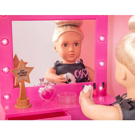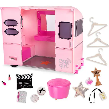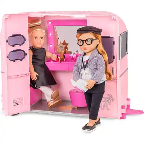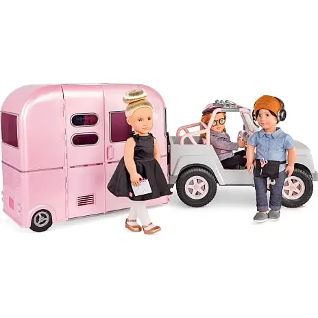 Inkluderer: lyserød trailer, sminkebord, 3 tøjbøjler, skammel og kosmetik. Kan sættes til vores generation Off Roader 4×4 (træk sælges separat). Kompatibel med de fleste 46 cm dukker. Dukker sælges separat.