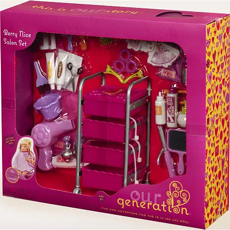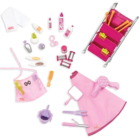 Salon-tilbehørssæt med 47 dele til 46 cm dukker. Inkluderer forsyningsvogn, stylistværktøjer, forklæde, beskyttelseshætte og mere! Kompatibel med de fleste 46 cm dukker, herunder American Girl og Journey Girl.