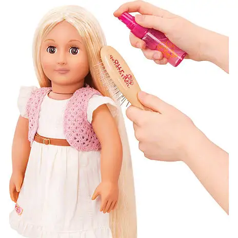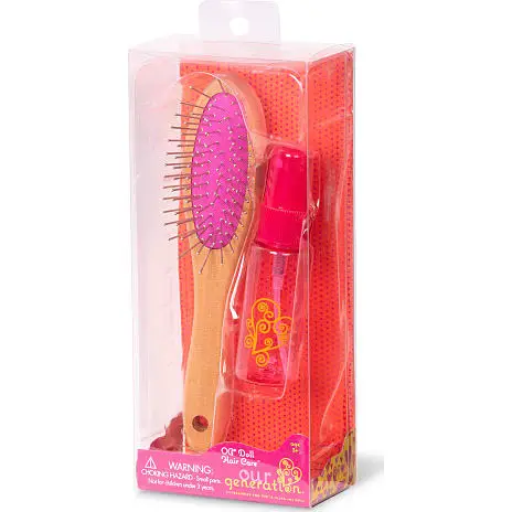 Hårplejesæt til 46 cm dukker. Sættet indeholder en børste af træ og en sprayflaske.