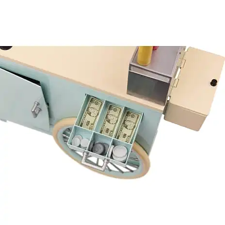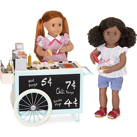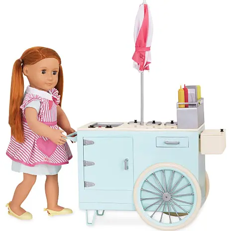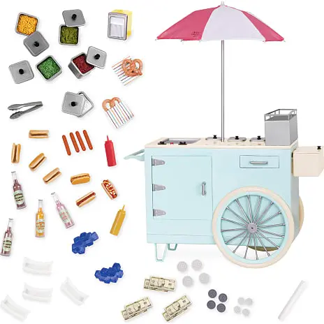 Inklusiv: 1 retro hot dog vogn, 1 paraply, 2 isterningesæt, 4 cola flasker, 1 chili hot dog med brød, 4 almindelige hot dogs, 4 hot dog brød, 1 hot dog med ketchup, 1 hot dog med sennep, 4 madbakker, 2 pretzels med papirsposer, 1 salatbeholder med låg, ostebeholder med låg, relish, løgbeholder med låg, 1 sennep, 1 ketchup, 1 servietholder, 1 tang, 4 mønter med 5 cent, 4 mønter med 10 cent, 4 mønter med 25 cent, 6 bonrulle og stykke kridt.