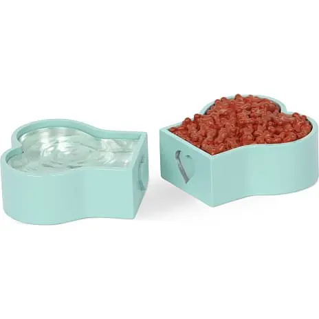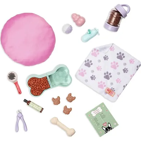 Tilbehørssættet består af et rundt hundetæppe, mønstret håndklæde, madskål, godbider, kødben, børste, negleklipper, sprayflaske og diverse hundelegetøj.