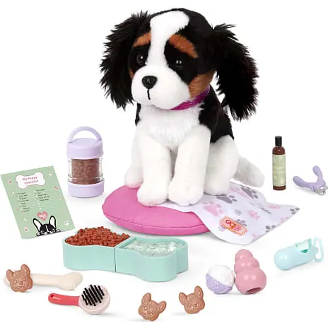 Kommer med: 1 hvalpe-tjekliste, 1 hundepude, 1 blødt tæppe, 1 hundefoder beholder, 1 legetøj, 3 småkage godbidder,1 ben, 1 børste, 1 afføringspose dispenser, 1 legetøjskugle, 1 shampooflaske, 1 fastgørbar hundemadsskål.
