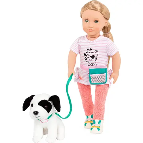 Inkluderer: Dukke, top, leggings, sko, undertøj, hund, halsbånd med medalje, snor, hundemads rejsecontainer, affaldspose til hund, pose til godbidder.
