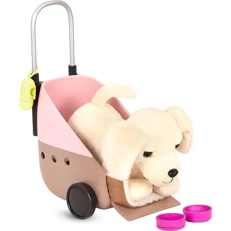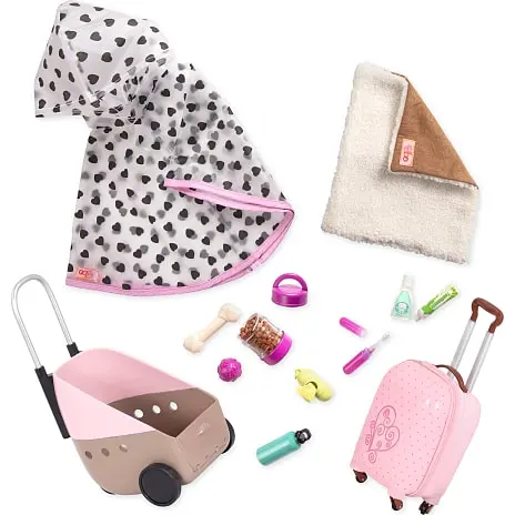 Her har du alt hvad din Our Generation dukke behøver for at rejse og tage sin hvalp med på turen, også selv om det regner!
