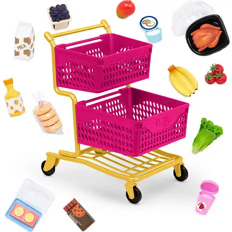 Fyld kurvene op med velsmagende favoritter fra de 5 fødevaregrupper – inklusive stegt kylling og laks, bagels, frugter og grøntsager. Glem ikke mælken! Indkøbskurven har en nederste opbevaringsbakke og 2 rummelige kurve til at gemme alle varerne fra din lille shoppers indkøbsliste, med plads til ekstraudstyr som appelsinjuice og en karamel-småkagechokoladebar.
