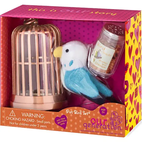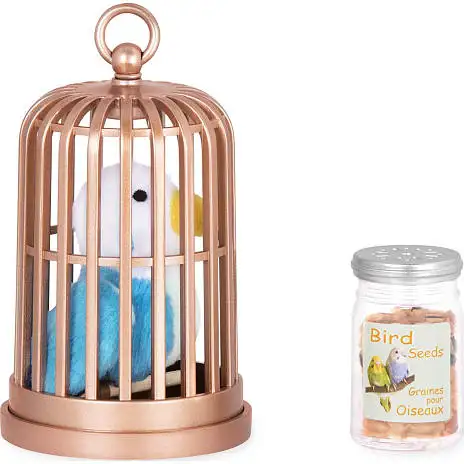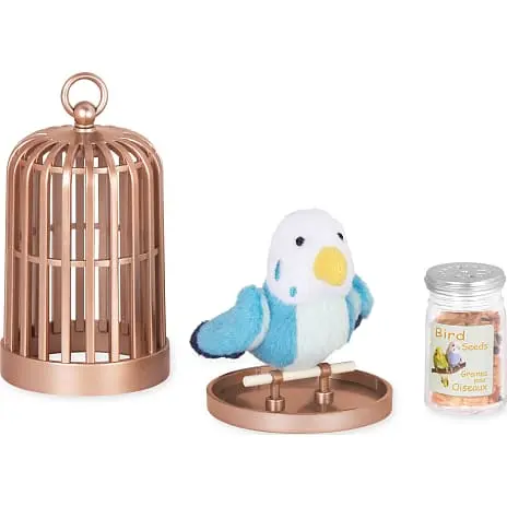 Denne bedårende mini-fugl i et bur vil helt sikkert få det til at føles som “”Home Tweet Home!”” Denne superbløde plys er det perfekte kæledyr til din bedste veninde, der elsker fugle. Dens “”fjer”” er lyse blå og hvide med et gult næb og måler 5 cm i længden og 5 cm i bredden – lige den rigtige størrelse, som dine 46 cm dukker kan holde i deres hænder! Fugleburet kan nemt åbnes i bunden, så det passer til dit nye kæledyr, og du kan fodre din fjerede ven, når den er sulten, med krukken med fuglefrø!