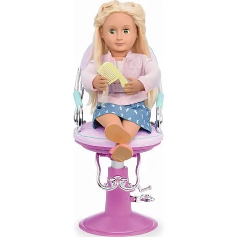 Salonstol til 46 cm dukker. Inkluderer: salonstol, fladjern, saks, hårtørrer, hårklip og børste. Brug fodpedalerne til at hæve og sænke stolen!