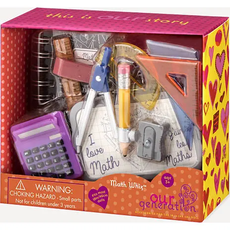 Sættet inkluderer værktøjskasse, kuglepen, blyantspidser, viskelæder, vinkelmåler, ligebenet trekantet lineal, rektangulær trekantet lineal, kompas samt notesbog.