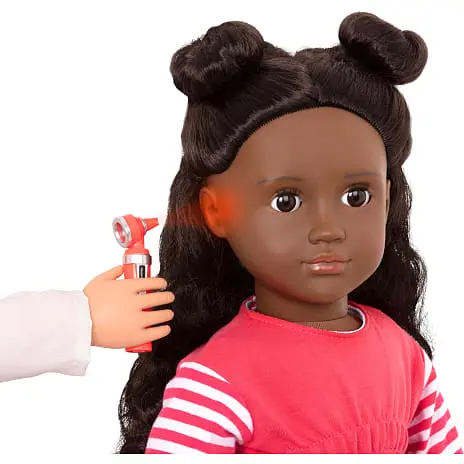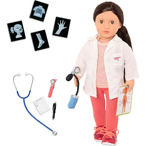 Med dukken medfølger: blodtryksmåler, stetoscope, otoscope med lys til at undersøge øregangen, scannings billeder, pen og blok