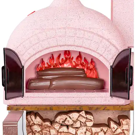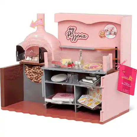 Tilføj velsmagende toppings med pepperonirullen og skub din pizza ind i brændeovnen på pizzasbaggen. Tryk derefter på knappen for at begynde at lave mad med ildlyden! Når det er tid til at skære i skiver, kan du stable pizzaerne på det drejelige tårn.