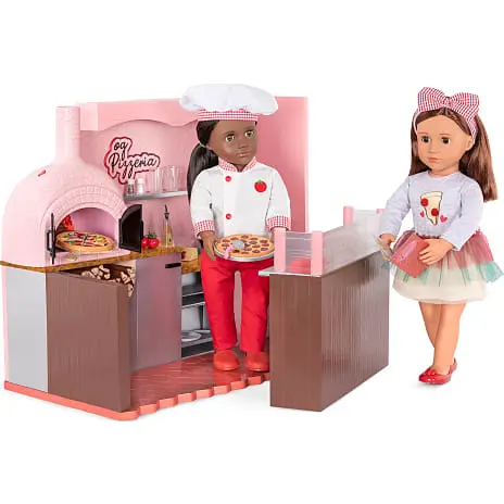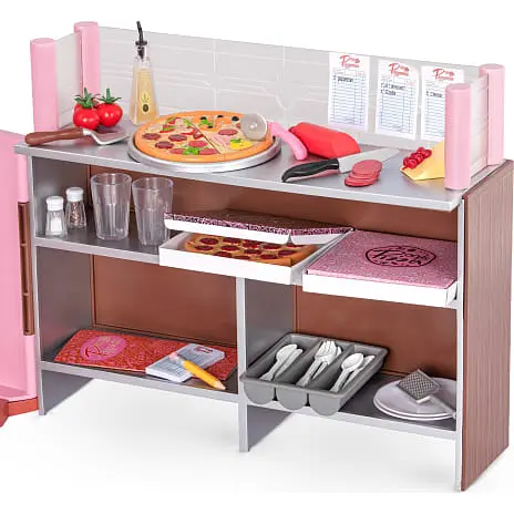 Our Generation Pizzeria indeholder: pizzeria, tilberednings bord, pizzaæsker, dobbeltsidet menu, pizzaserver, pizzabakke, pizzaskiver, fadestativ, salt og peberbøsse, flaske olivenolie, fade, pizzaskærer, køkkenkniv, blyant, tomatbundt, osteblok, knive, gafler, skeer, ostehøvl, peberfrugtrulle, bestillingsblok, peberfrugt.