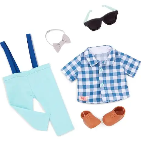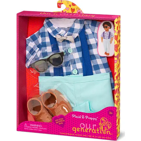 Klæd din 46 cm drengedukke på til fester, skoledage og alt muligt sjovt med Our Generation Plaid & Preppy-outfittet! Træd ind i moderigtig stil med den ternede top, og sæt den sammen med de lyseblå bukser. De har søde seler, der gør udklædningen ekstra legesyg!