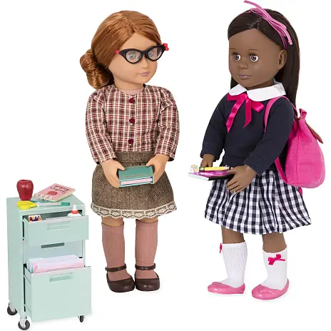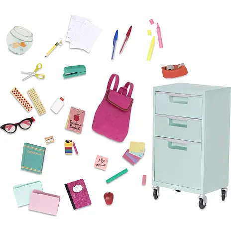 Skolesæt til 46 cm dukker. Inkluderer arkivskab, rygsæk og masser af skoleartikler.