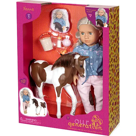 Sammen med Yanira og føllet medfølger også en spand, strigle, sutteflaske og træningslegetøj.
