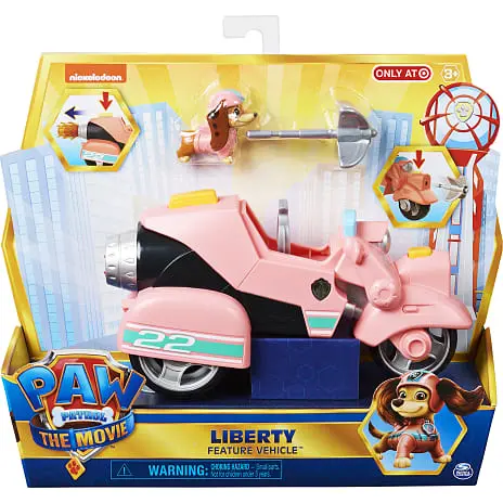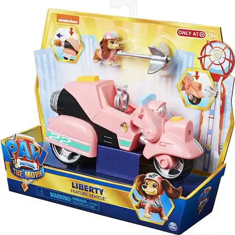Slå dig sammen med den nyeste PAW Patrol hvalp, Liberty, for større, dristigere redninger med hendes PAW Patrol: Filmen køretøj! Liberty’s slanke by køretøj har sølv metallisk maling, autentiske filmdetaljer og grafik, en projektil løfteraket, plus en raket boost direkte fra filmen! Klædt i hendes film uniform, Liberty (samlerobjekt action figur inkluderet) er klar til at redde dagen i Adventure City. Når problemer rammer, sæt Liberty ind i førersædet og sus til undsætning! Hvis du vil have ekstra fart, skal du trykke på knappen på bagsiden for at aktivere raketboostet – når du trykker på Libertys køretøj, roterer flammen! Lad gribekrogsprojektilet ind foran på køretøjet, og tryk på knappen for at starte! Liberty og hendes køretøj bringer handling og spænding fra det store lærred til live! Dette køretøj er en fantastisk gave til børn og er et must-have for din PAW Patrol køretøjer og legetøjsfigurer samling – det er det eneste sted at finde Liberty og hendes køretøj! For endnu mere film handling, skal du bruge Liberty’s køretøj med den helt nye PAW Patrol tårn, Ultimate City Tower (sælges separat) og samle alle PAW Patrol: Filmen Deluxe Køretøjer (legetøjsbiler sælges separat). Red dagen med Liberty og hendes PAW Patrol: Filmen Køretøj!