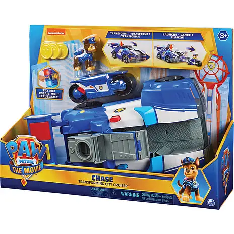 Forvandl, sæt i gang og red dagen med Chase og hans PAW Patrol: The Movie Transforming City Cruiser. Denne 2-i-1 politibil og motorcykel bringer PAW Patrols handling og spænding: The Movie bliver levende.