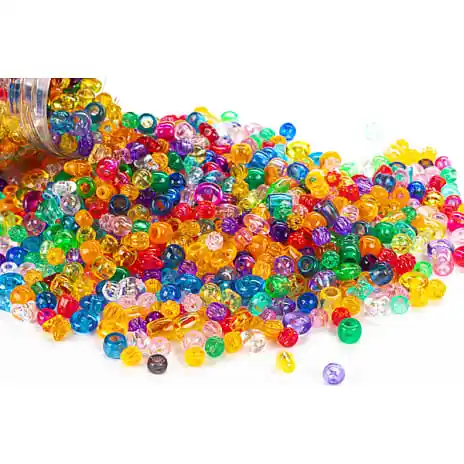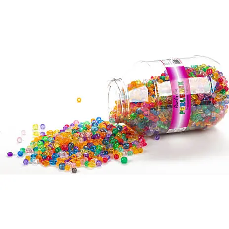Plastperler i forskellige farver, former og stærrelser.