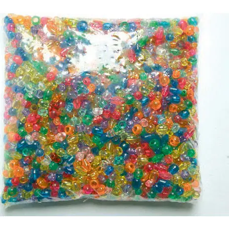 Plastperler i forskellige farver, former og stærrelser.