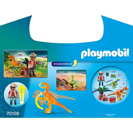Dinosaurfans vil elske denne detaljerede Playmobil Dino Explorer bæretaske. Udstyret med et kort og en kikkert, tager dinosaurforskeren afsted på jagt efter de forhistoriske firben. Han har allerede opdaget deres spor på jorden. Vil dinosaurerne vise sig selv? Store dinosaureventyr venter alle dinosaurfans.