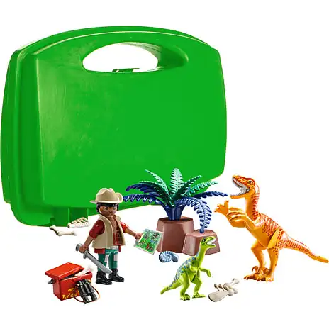 Sættet inkluderer 1 opdagelsesrejsende, 2 velociraptorer, 3 knogler, kikkert, kort og mange andre ekstra ting. Når legen er ovre, kan du blot opbevare brikkerne i etuiet til næste gang!