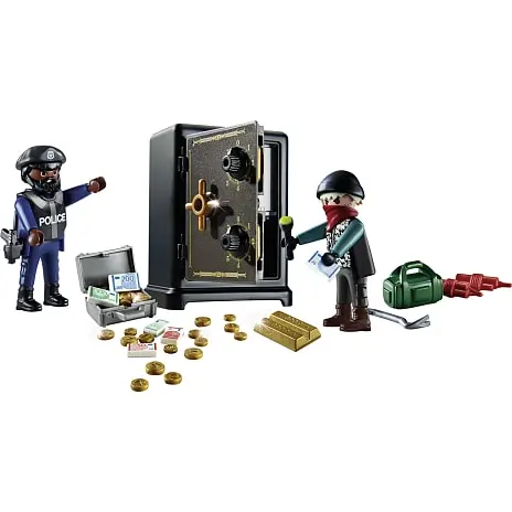 En tyv er ude efter bankens pengeskab. Det er lykkedes ham at bryde pengeskabet op med et brækjern og er nu i færd med at skovle pengene ned i en kuffert. Men han var ikke hurtig nok: Pludselig bliver han overrasket af en politimand. Nu er han lagt i håndjern, og nu er han på vej til politistationen. Denne PLAYMOBIL bankrøveri-startpakke er en god introduktion til den spændende verden af PLAYMOBIL City Action, hvor børn kan blive hverdagens helte i hjertet af handlingen. Sættet indeholder en politimand og en tyv, et pengeskab, guldbarrer, penge, dynamit, et brækjern og meget andet ekstraudstyr. Boksen kan kun åbnes, hvis den korrekte talkombination er blevet indstillet ved hjælp af de roterende skiver. Boksen kan også bruges som sparegris.