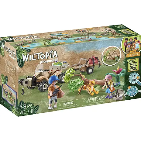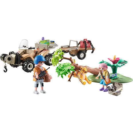 Dyrenes redningsaktion af den sårede jaguar, som var fanget i et væltet træ. Rednings-ATV med spil, anhængertræk og anhænger. Indeholder omfattende veterinærtilbehør, bandageklistermærker og dyresamlekortet “Jaguar” med spændende lydindhold.