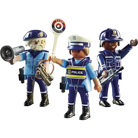 Forstærkning til PLAYMOBIL-politistyrken fås med figursættet Politi. Tre ekstra politifigurer med megafon, stopskilt (slikkepind), politiradio og andre tilbehørsdele til politiet venter på deres indsats.