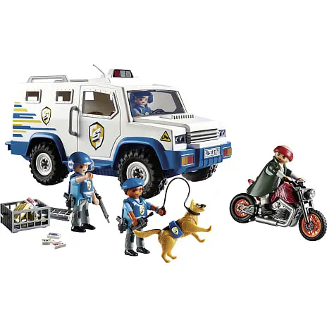 Pengetransporten er lige blevet læsset, og kører nu af sted. Alt ser fredeligt ud, og de to politibetjente er afslappede. Pludseligt dukker der en grisk skurk op på sin quad og forsøger at stoppe transporteren. Åh, hvad er det! Politibetjenten bag rattet bremser og åbner så endda også bagdøren for skurken. De to har slået sig sammen! På et øjeblik har de ryddet transporteren og stikker af. Men kollegerne fra politiet er allerede blevet alarmeret. De når ikke langt!