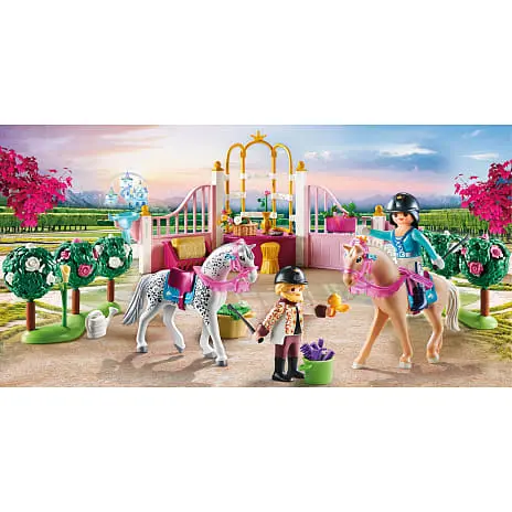 Legesættet består af PLAYMOBIL-figurerne Pina og kongen, to heste og en fugl, staldelementer og et skab med skuffer, hvor der kan opbevares småting. Sættet indeholder også ridehjelme og en saddel samt en ny damesaddel, som kan bruges til figurer med nederdel.