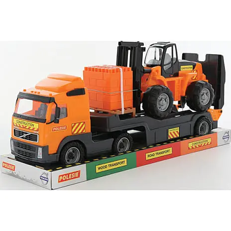 Gaffeltrucken har hæve- sænke funktion og kommer med en palle fyldt med klodser, så der er meget forskelligt leg i dette sæt. Lastbilens lade kan hæves og sænkes, så trucken kan kære på og fra laddet igen.