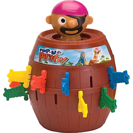 Det populære piratspil, hvor man en efter en sætter sværd ind i pirattønden. Et af sværdene vil få piraten til at hopper op, men man ved aldrig hvilket!