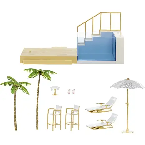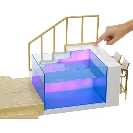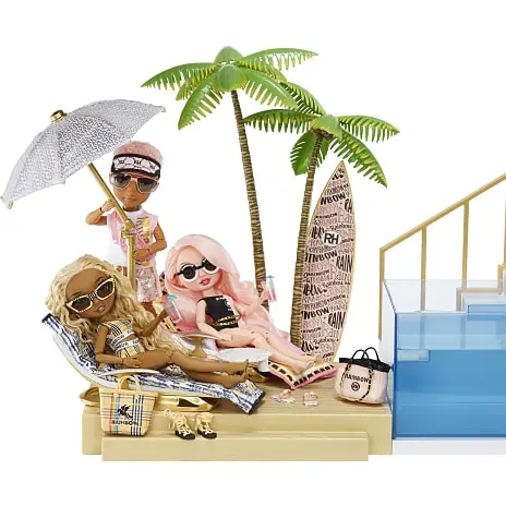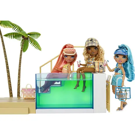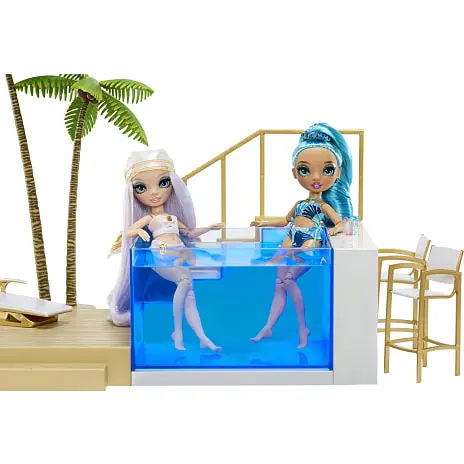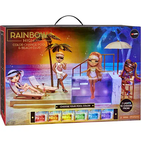 Pigerne på Rainbow High er klar til at have det sjovt i solen og tage en dukkert i den storslåede pool, der kan skifte farve. Poolen lyser op i alle regnbuens farver og er de perfekte rammer for et must-have Rainbow High sommerparty. Poolen er supernem at fylde og tømme, og selvfølgelig medfølger der stole. palmer og meget andet, der skal til for at skabe de rette omgivelser. Dukker sælges separat. Fra 5 år.