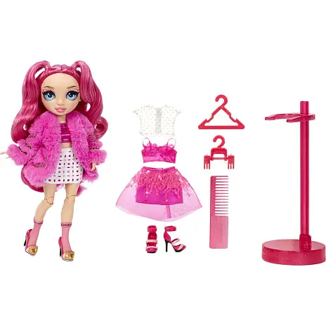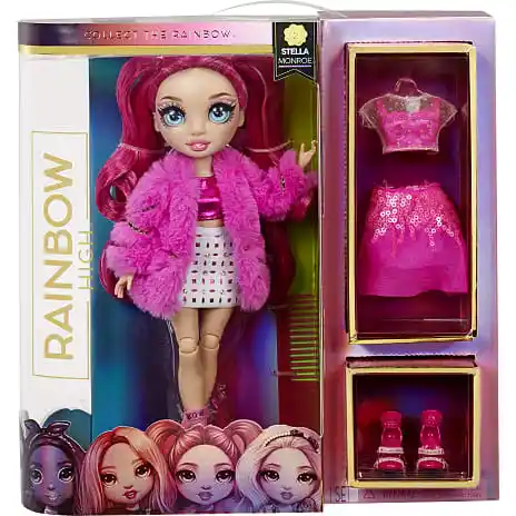 Tjek de nye dukker ud, som bliver føjet til Rainbow High Fashion dukkekollektionen. Regnbuen har mere end 6 farver. Derfor kommer der nu yderligere 6 nye fabelagtige piger og 1 dreng som repræsentanter for regnbuens forskellige nuancer. De har hver især deres unikke stil, som kommer til udtryk gennem deres 2 outfits og deres mange fashiontilbehørsdele. Og de har flot langt hår, du kan børste. Når du stiller dem op side om side allesammen, danner de selvfølgelig en flot regnbue. Saml regnbuen! Fra 5 år. Inkluderer: – Stella Monroe, smuk fashiondukke med mange detaljer – kam – ekstra fashion outfit (2 sæt i alt) – fashiontilbehør (øreringe, pung, sko..) – bøjler – dukkestativ