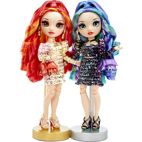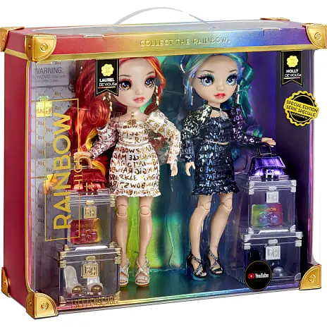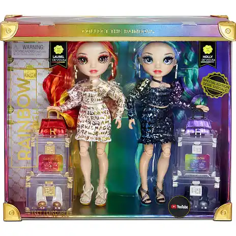 Tvillingerne Laurel og Holly De’Vious er fra vores fantastiske Rainbow High Fashion særkollektion. Tvillingerne kommer i en unik indpakning, som er specielt designet for at kunne udstille de to dukker side om side. De er klædt i varme og kolde farver, således at de danner en hel regnbue, når du stiller dem op ved siden af hinanden. Godt nok ser de søde og venlige ud, men lad dig ikke narre af deres flotte hår og outfits, for disse piger er parate til at skabe drama på Rainbow High. Fra 5 år.