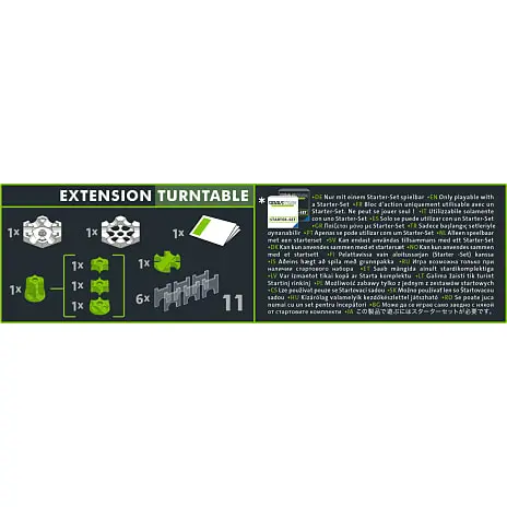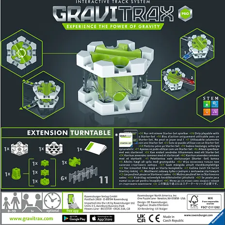 Få kontrol over kuglernes retning! Når din kugle falder ned på drejepladen, ændrer den retning og får drejepladen til ad dreje rundt. Turntable giver dig mulighed for endnu flere banevariationer og mere kontrol over kuglens retning. Kombineret med et Starter sæt kan du bygge endnu mere udfordrende baner. Hvor mange gange kan du får Turntable til at dreje rundt? Dette sæt indeholder 1 x Turntable. Dette STEM-system [Science, Technology, Engineering and Maths] er ideelt til at lære børn om tyngdekraft, magnetisme, kinetisk energi og sjov. Er du stødt på en forhindring? Freestyle med dit eget banedesign, eller løs de medfølgende opgaver, der hjælper dig med at komme i gang med GraviTrax! Bliver kuglen stoppet af tyngdekraften, eller flyver den væk, inden den når målet? Tid til at løse udfordringerne. Byg om, og prøv noget andet! GraviTrax banen kan udvides i det uendelige med ekstra skinner og tilbehør – der sælges separat.