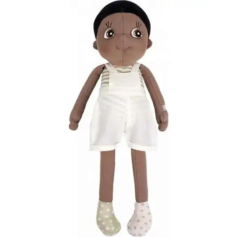 Jeg er en blød, håndlavet dukke klædt ud i: En stribet / prikket top og sko, Et aftageligt par dungaree-shorts.