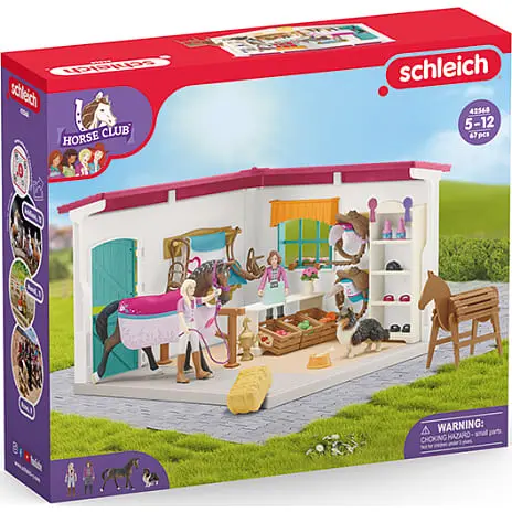 Ding-dong! Der er kunder! Man kommer til rideudstyrsbutikken fra schleich®® HORSE CLUB for at ose i timevis og forlader butikken med et stort smil på læben. Enten fordi man har fundet noget helt fantastisk til sin hest, eller fordi damen bag disken har sagt noget pænt til en. For hun er altid begejstret for alle hestene i din kollektion. Hun har kun det bedste i sin butik. Foder, sadler, børster, sågar en hund – og måske endda det hårspænde, du tabte i sidste uge. Jeg er sikker på, at hun meget snart giver dig stamkunderabat, og hun har altid et venligt ord.