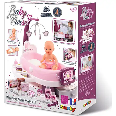 Med dette elektroniske puslebord kan dit barn lære at tage sig af sin dukke, og prøve kræfter med, hvordan det er at være en rigtig forælder. Dit barn vil blive guidet af den aftagelige elektroniske tablet, der viser hvad der skal gøres for at imødekomme dukkens behov. Tabletten er udstyret med en LED- og lydfunktion, som tænder for at indikere, hvad der er galt med dukken, og hvad man skal gøre for at løse problemet. Dit barn kan skifte ble på sin dukke, fodre den og pleje den.