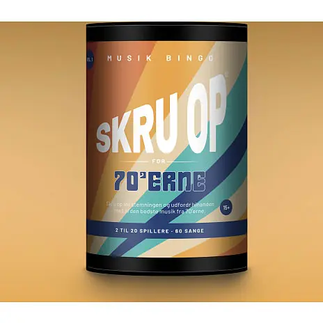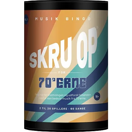 Musikbingo som brætspil. Skru op er som klassisk bingo, hvor tallene er skiftet ud med musiknumre og deltagerne skal lytte sig frem til, om der spilles et nummer, som er på deres spilleplade. Spillet har enkle regler og man er i gang efter få minutter. Playlister tilgås via streamingtjenester eller oprettes manuelt. Indeholder al den bedste musik fra 70’erne.