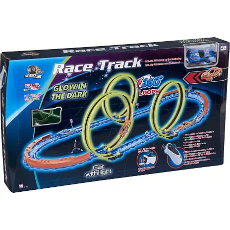 Bilbane med 3-dobbelt loop og 1 infrarødstyret bil. Sej bane med selvlysende effekt og infrarødstyret bil, hvor du kan vælge mellem 3 frekvenser og vælge mellem forskelligt lys på bilen. 103x51x23 cm. Der medfølger USB-kabel til opladning af bilen og der skal bruges 2 stk. AAA-batterier til fjernbetjeningen (ikke inkl.). Inkl. 1 infrarødstyret bil med lys og fjernbetjening samt USB-kabel