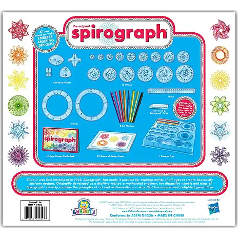 Dette sæt indholder: 19 Spirograph-præcisionshjul, 2 Spirograph-præcisionsringe, 1 Spirograph-præcisionsstativ, 5g genanvendelig Spiro-Putty, 8 tusser, 14 siders instruktionsbog, 20 ark designpapir, 1 opbevaringsbakke.