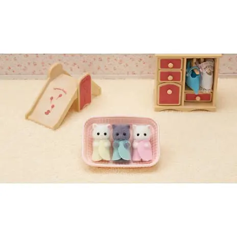 Familien Sylvanian Perserkat Trillinger er to piger og en dreng. De utroligt søde katte Blair, Blake og Briana er del af den tofarvede Familien Perserkat Blair er viklet ind i et gult klæde, Blake et turkis, og Briana et rosafarvet. Alle tre katte ligger sammen i en lille kurv. Alle tre Familien Sylvanian Perserkat trillinger er ca. 3,5 cm høje og egnede til børn fra 3 år.