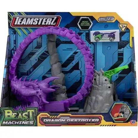 Beast Machines køretøjs legesæt som har en slam launcher og en fleksibel dragekrop, der kan være spilles fladt eller krøllet for at skabe en sløjfe! – Prøv at undslippe dragens kæber som lukkes for at fange din hastighed Beast Machine! – Indeholder 1 x støbt Beast Maskiner køretøj på ca. 3” Die-cast Køretøjet har trykstøbt bil.